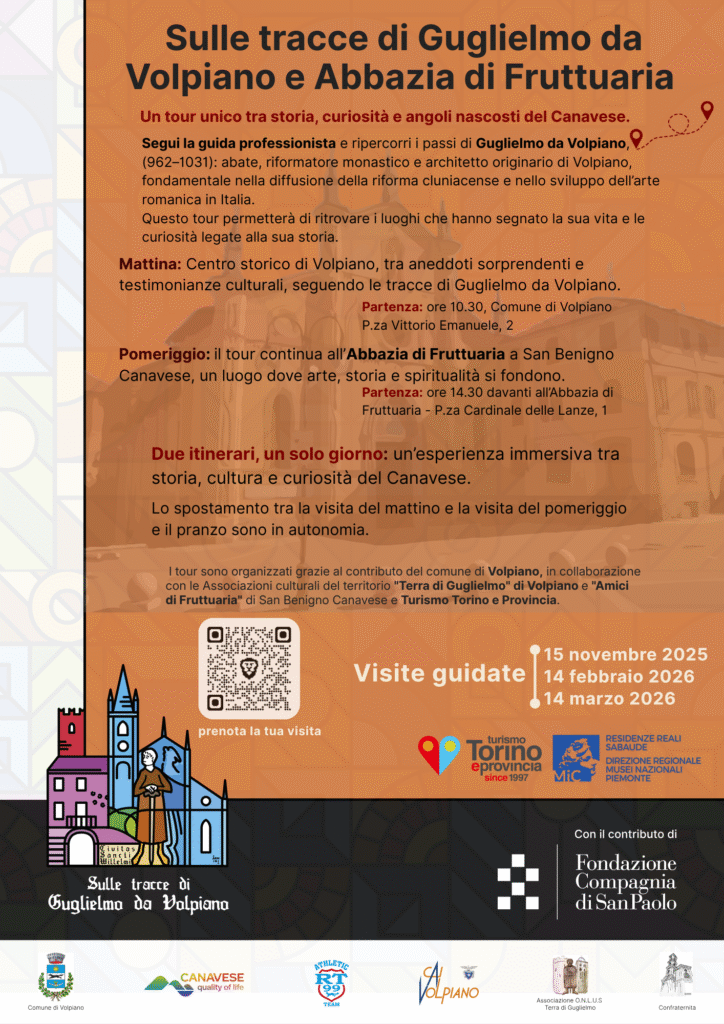 La prossima visita guidata di “Sulle tracce di Guglielmo da Volpiano e Abbazia di Fruttuaria” è in programma sabato 14 febbraio 2026.