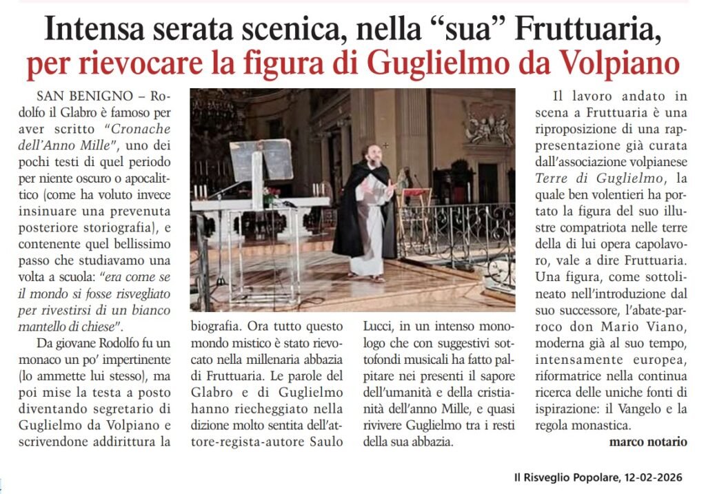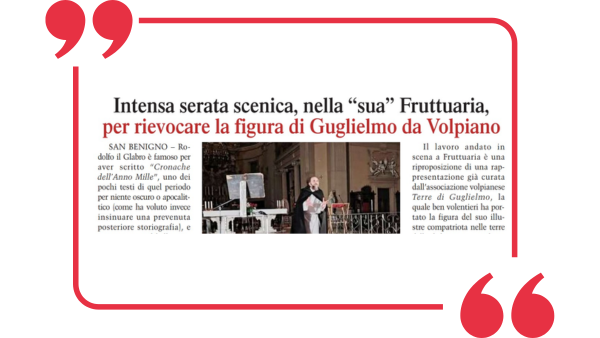 Il lavoro andato in scena a Fruttuaria è una riproposizione di una rappresentazione già curata dall’associazione volpianese Terre di Guglielmo, la quale ben volentieri ha portato la figura del suo illustre compatriota nelle terre della di lui opera capolavoro, vale a dire Fruttuaria. Una figura, come sottolineato nell’introduzione dal suo successore, l’abate-parroco don Mario Viano, moderna già al suo tempo, intensamente europea, riformatrice nella continua ricerca delle uniche fonti di ispirazione: il Vangelo e la regola monastica.